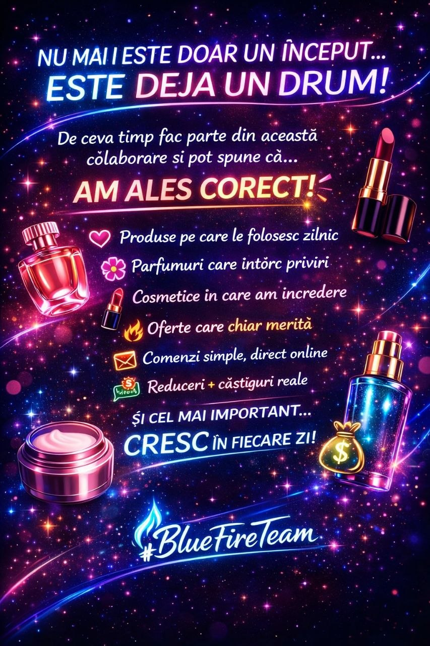 #BlueFireTeam✨💄 𝐍𝐮 𝐦𝐚𝐢 𝐞𝐬𝐭𝐞 𝐝𝐨𝐚𝐫 𝐮𝐧 𝐢𝐧𝐜𝐞𝐩𝐮𝐭… 𝐞𝐬𝐭𝐞 𝐝𝐞𝐣𝐚 𝐮𝐧 𝐝𝐫𝐮𝐦! De ceva timp fac parte din această colaborare și pot spune că… 𝐚𝐦 𝐚𝐥𝐞𝐬 𝐜𝐨𝐫𝐞𝐜𝐭! 💥 💖 Produse pe care le folosesc zilnic 🌸 Parfumuri care întorc priviri 💄 Cosmetice în care am încredere 🔥 Oferte care chiar merită 📦 Comenzi simple, direct online 💸 Reduceri + câștiguri reale Și cel mai important… ✨ 𝐜𝐫𝐞𝐬𝐜 𝐢𝐧 𝐟𝐢𝐞𝐜𝐚𝐫𝐞 𝐳𝐢! Dacă și tu vrei: 💫 produse bune 💫 un venit extra 💫 un mediu unde evoluezi 👉 Scrie-mi și îți arăt cum funcționează! 🔥 𝐍𝐮 𝐦𝐚𝐢 𝐞 𝐝𝐨𝐚𝐫 𝐮𝐧 “𝐡𝐚𝐢 𝐬𝐚 𝐯𝐚𝐝”… 𝐞 𝐜𝐞𝐯𝐚 𝐜𝐞 𝐜𝐡𝐢𝐚𝐫 𝐦𝐞𝐫𝐠𝐞! #BlueFireTeam ✨· 0 Comentarii ·0 Distribuiri ·156 Vizualizări5