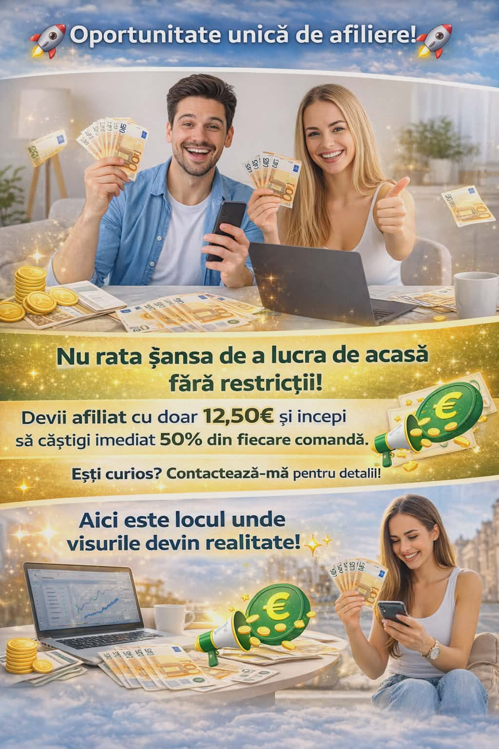 Fără cerințe complicate sau pachete de start. Cu doar 12,50€devii afiliat și poți câștiga 50% din prima comandă!